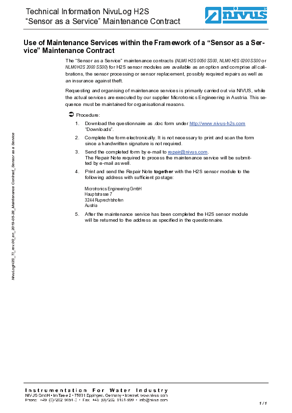 Technical Information NivuLog H2S "Sensor as a Service" Maintenance Contract