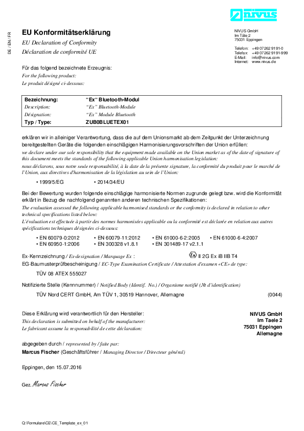 Konformitätserklärung "Portabler Durchflussmessumformer NivuFlow Stick"