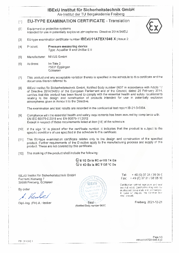EC type examination certificate pressure measuring devices incl. supplement