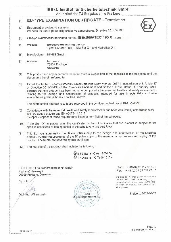 EC type examination certificate pressure transmitter