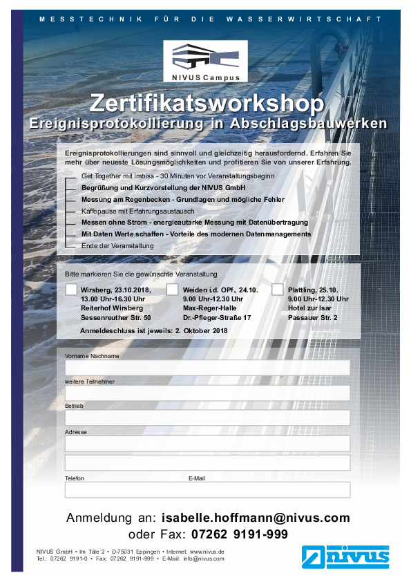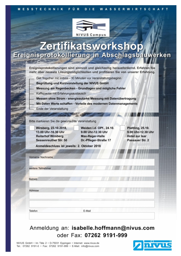 Anmeldeformuler für unsere kostenlosen Workshops „Ereignisprotokollierung in Abschlagsbau-werken“ am 23., 24. und 25.10. in Wirsberg, Weiden in der Oberpfalz oder Plattling