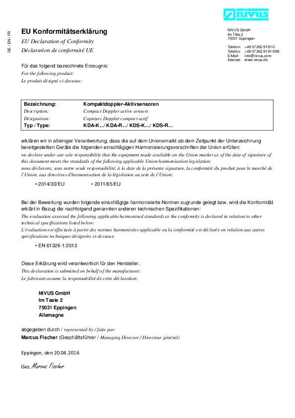 EU Izjava o sukladnosti "Kompaktni Doppler aktivni senzor KDA-K.../ KDA-R.../ KDS-K…/ KDS-R…"