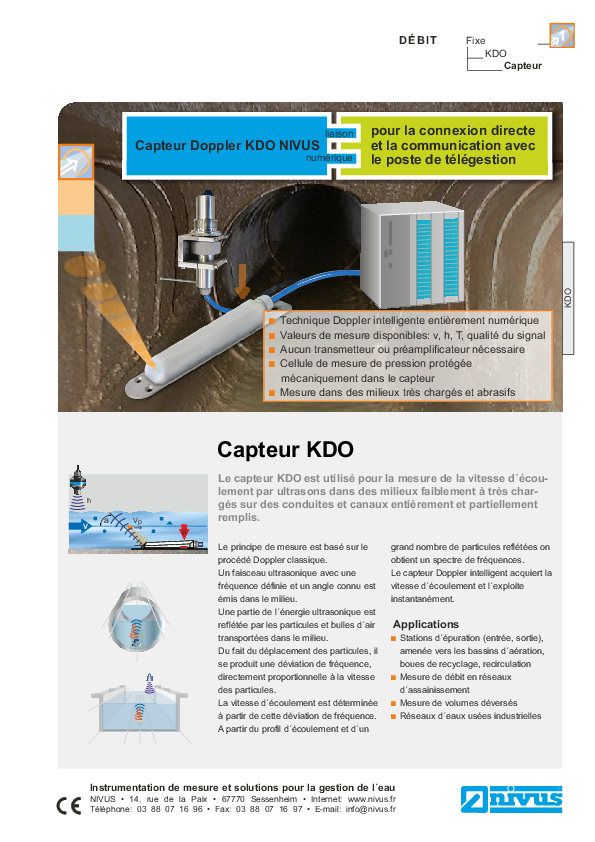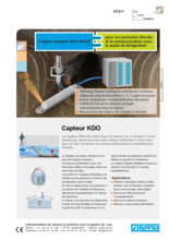 Le capteur KDO est utilisé pour la mesure de la vitesse d´écou-lement par ultrasons dans des milieux faiblement à très chargés sur des conduites et canaux entièrement et partiellement remplis.