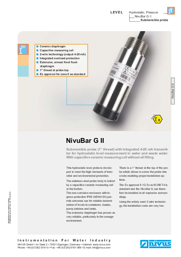 Submersible probe with thread and 4 – 20 mA transmitter for hydrostatic level measurement