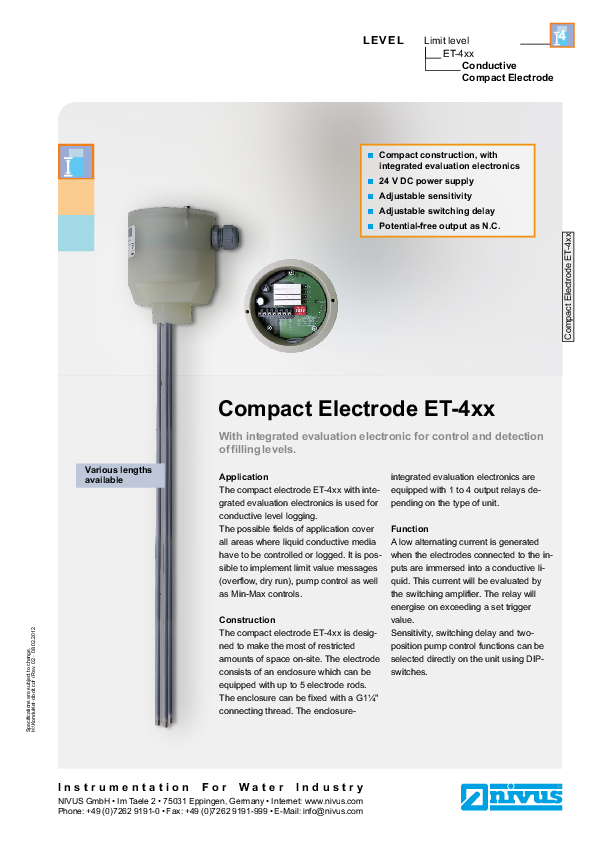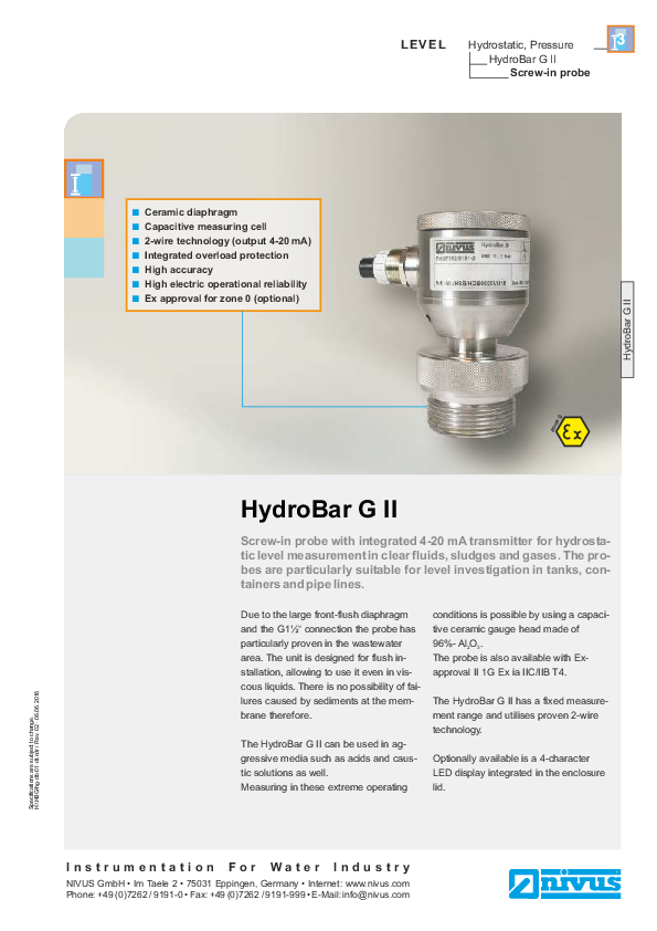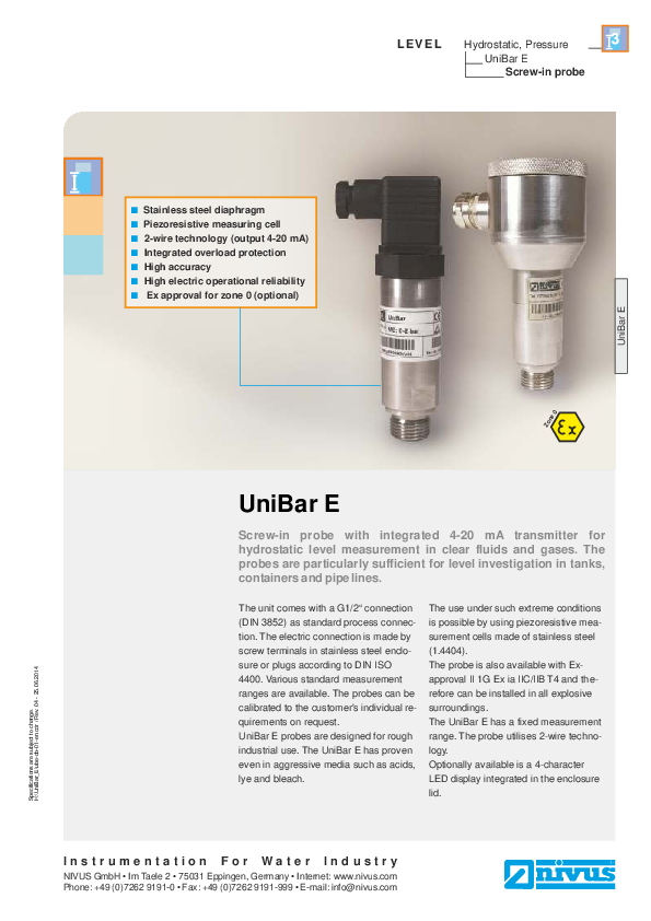 Screw-in probe with 4 – 20 mA transmitter for level measurement in clear fluids, sludges and gases
