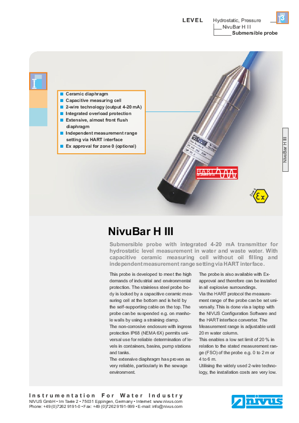 Submersible probe with 4 – 20 mA transmitter independent measurement range setting via HART interface