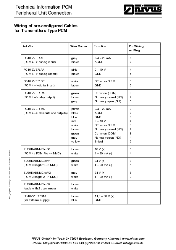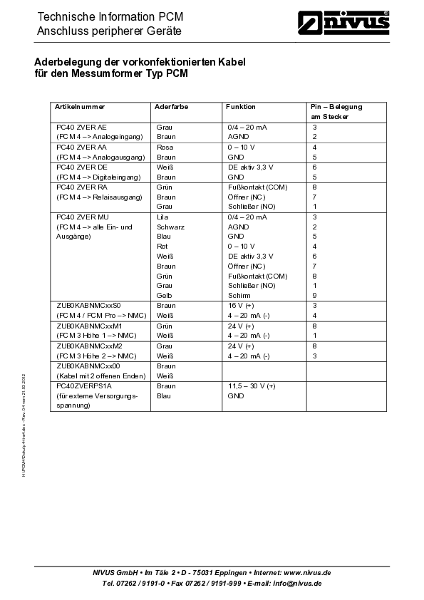 Aderbelegung der vorkonfektionierten Kabel für Messumformer Typ PCM
