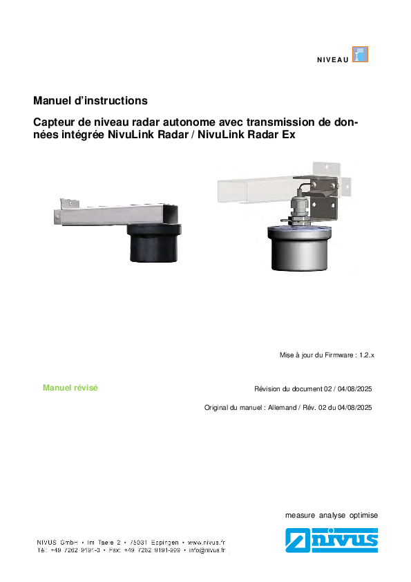 Manuel d’instructions | Capteur de niveau radar autonome avec transmission de don-nées intégrée NivuLink Radar / NivuLink Radar Ex (Rev. 02)