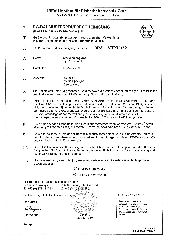 EG Baumusterprüfbescheinigung Druckmessgerät NivuBar H III