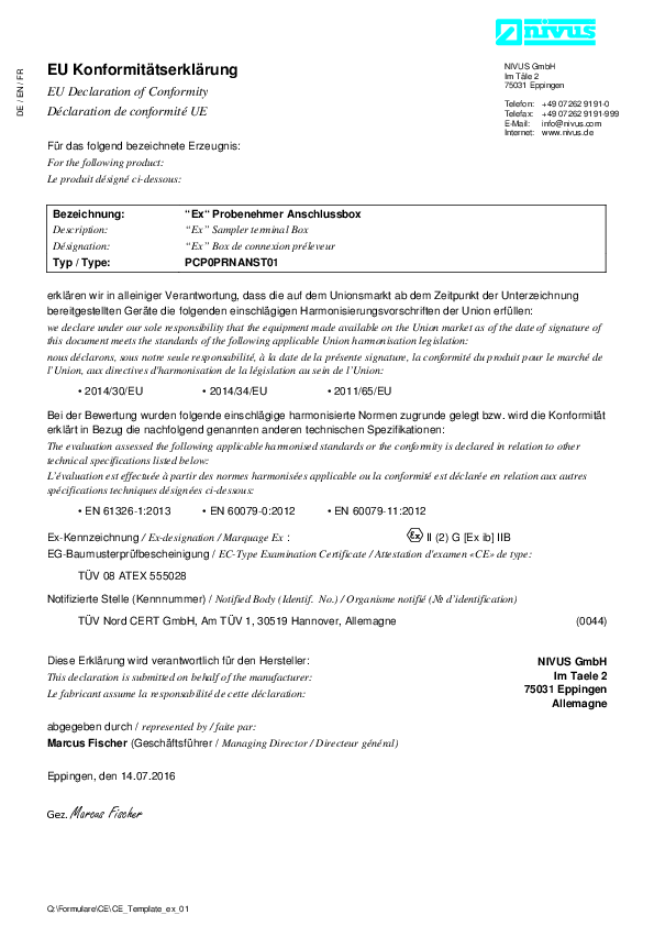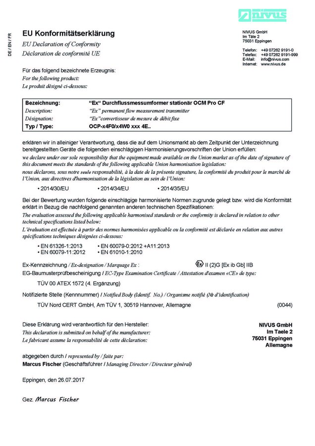 Declaration of Conformity "Ex Permanent flow measurement transmitter OCM F / OCM FR / NFP