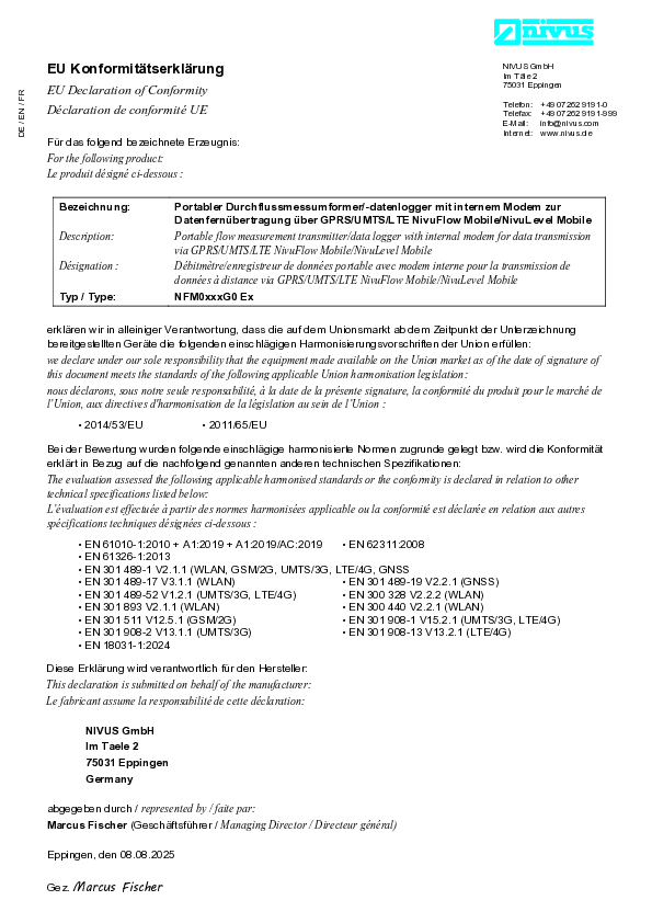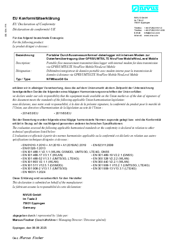 EU Konformitätserklärung | Portabler Durchflussmessumformer/-datenlogger mit internem Modem zur Datenfernübertragung über GPRS/UMTS/LTE NivuFlow Mobile/NivuLevel Mobile
