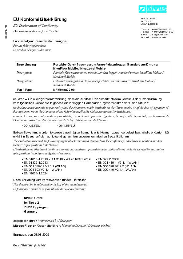 EU Konformitätserklärung | Portabler Durchflussmessumformer/-datenlogger, Standardausführung NivuFlow Mobile / NivuLevel Mobile