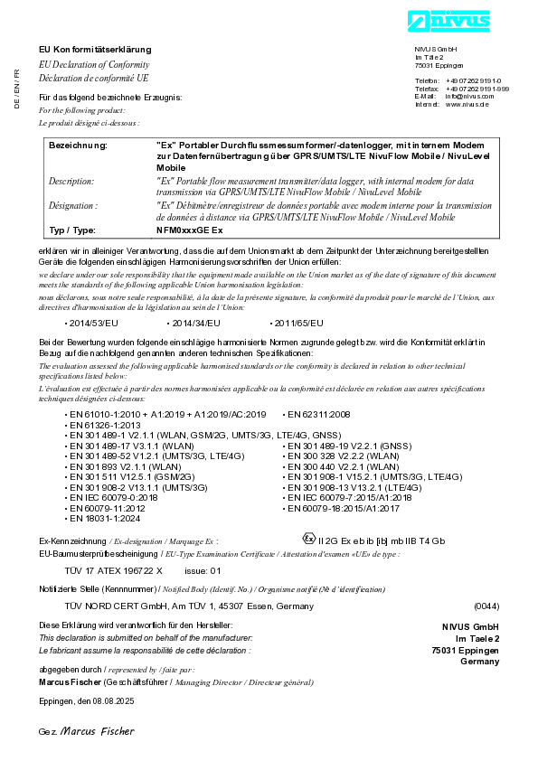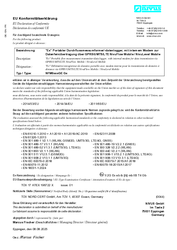 EU Konformitätserklärung | "Ex" Portabler Durchflussmessumformer/-datenlogger, mit internem Modem zur Datenfernübertragung über GPRS/UMTS/LTE NivuFlow Mobile / NivuLevel Mobile
