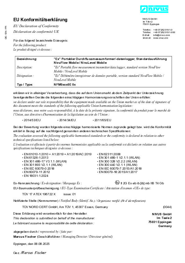 EU Konformitätserklärung | "Ex" Portabler Durchflussmessumformer/-datenlogger, Standardausführung NivuFlow Mobile / NivuLevel Mobile