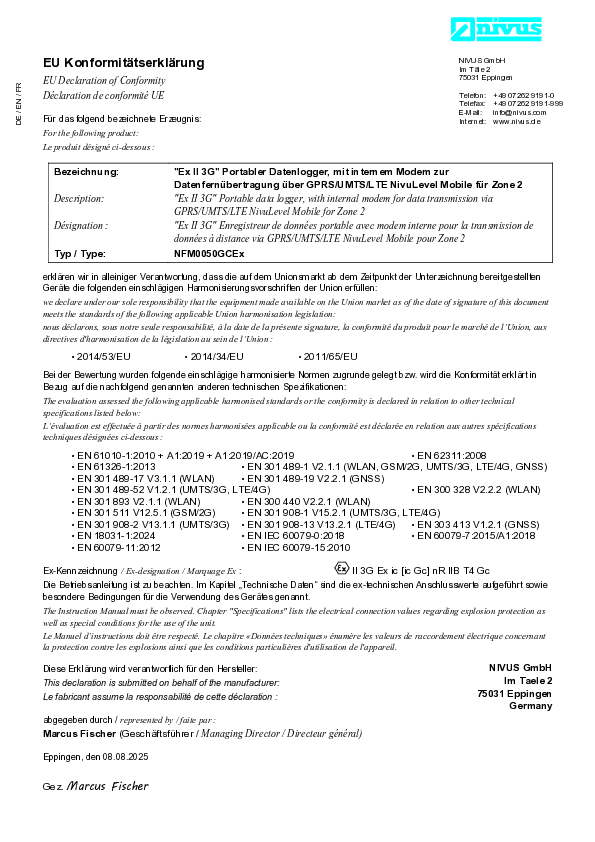 EU Konformitätserklärung | "Ex II 3G" Portabler Datenlogger, mit internem Modem zur Datenfernübertragung über GPRS/UMTS/LTE NivuLevel Mobile für Zone 2