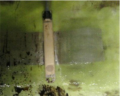 - Der Sensor wurde mit einem Montageblech und einem speziellen Kunstharzkleber auf dem Gerinneboden befestigt.