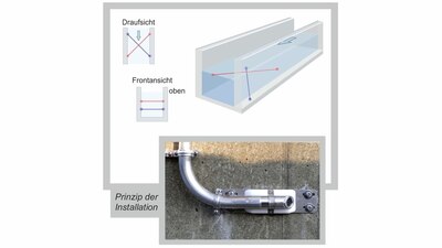 - Für eine hohe Messgenauigkeit wurde zur Kompensation der Schrägströmung nach der Kurve eine gekreuzte 2-Pfad-Messung mit 2 in unterschiedlicher Höhe montierten Laufzeitsensoren eingesetzt.