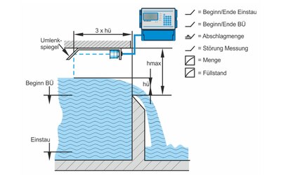 - Der Einsatz eines innovativen Umlenkspiegels für den Ultraschall ermöglicht die Befestigung des Sensors nahe des maximalen Wasserspiegels.