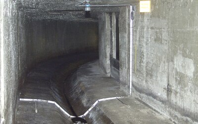 - Die Sensoren 2 und 3 wurden links und rechts der Trockenwetterrinne auf dem Bankett montiert. Gemeinsam mit dem Sensor 1 erfassen sie die Fließgeschwindigkeiten bei höheren Füllständen oder Mischwasserabfluss.