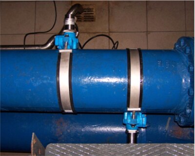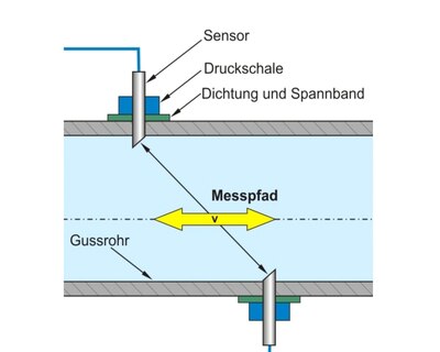 - Montage der Sensoren in permanent voll gefüllte Gussrohrdruckleitung erforderlich (keine Absperr- oder Entleerungsmöglichkeiten)