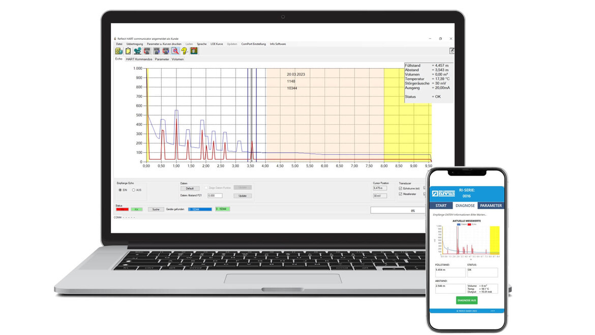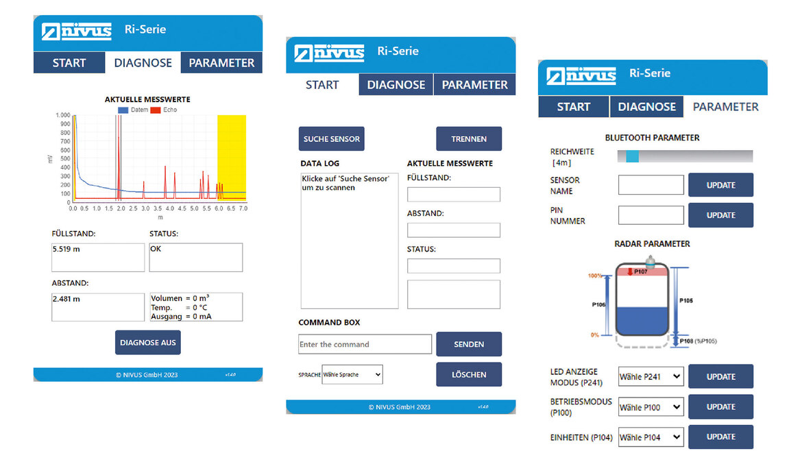 Der Ri-Sensor bietet mit einer webbasierten Bedienoberfläche eine einfache und bequeme Möglichkeit, Parameter zu ändern, Echokurven anzuzeigen und die Bluetooth-Reichweite zu ändern. Diese Web-App ist über jeden Browser auf allen Betriebssystemen (Windows, Android oder iOS) zugänglich. Im Vergleich zu einer herkömmlichen App müssen keine Software und zugehörigen Updates installiert werden.