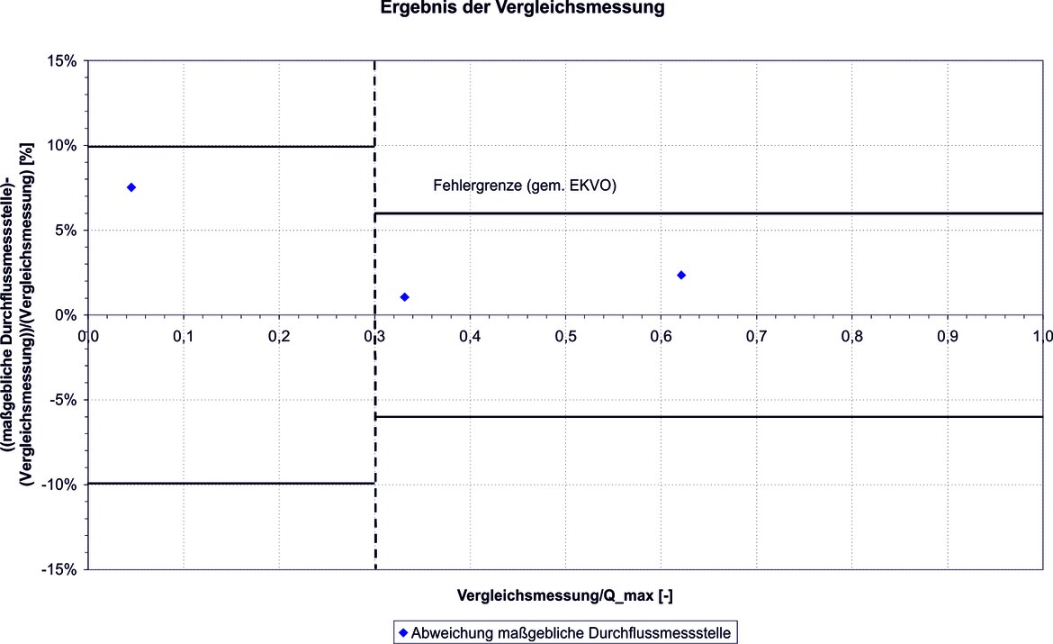 - Ergebnis: relative Abweichung vom Kontrollwert befindet sich für die jeweiligen Durchflussteilbereiche innerhalb der zulässigen Größenordnung