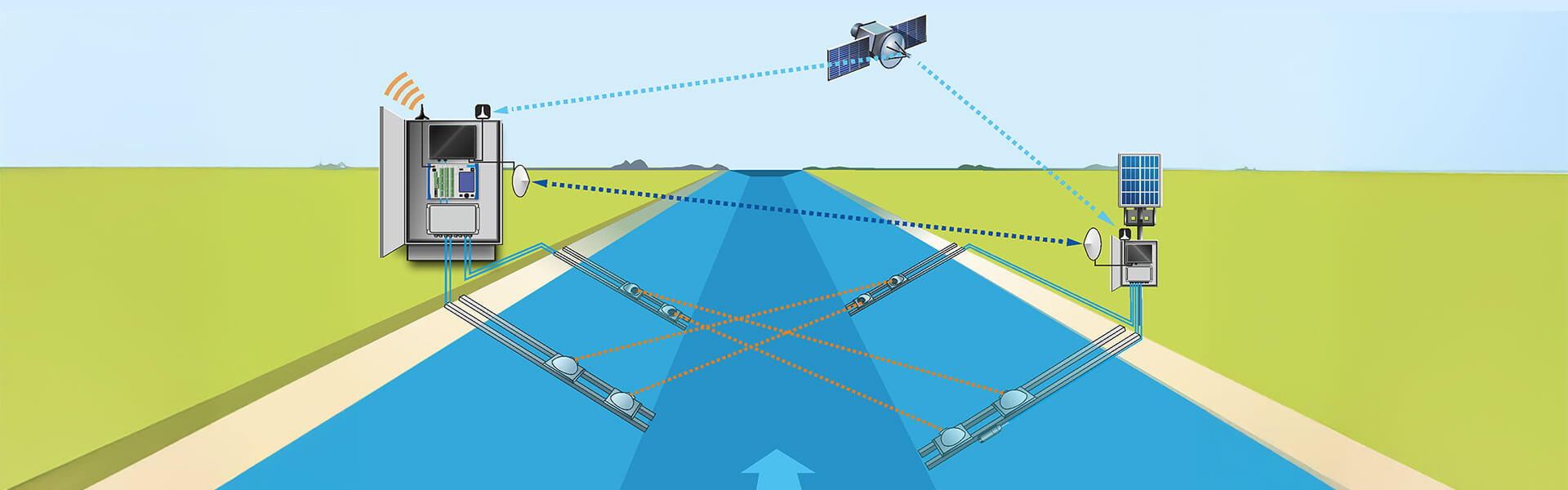 Unser Wireless Transit Time-System ermöglicht die präzise Erfassung von Fließgeschwindigkeiten mittels Laufzeitdifferenzverfahren – und das ohne die Notwendigkeit Kabel durch den Fluß oder Kanal zu legen. Die Sensorpfade kommunizieren drahtlos mit dem Auswertegerät NivuFlow 650. Die Systemzeiten beider Flussseiten werden per GPS synchronisiert – mit einer Genauigkeit im Nanosekundenbereich. Damit entfällt die Notwendigkeit der Flussquerung oder einer festen Infrastruktur wie Brücken. In Kombination mit einer eigenen Energieversorgung können neue Messstellen damit rein nach hydraulischen Gesichtspunkten ausgewählt werden. Ebenfalls wird der Aufwand für die Installation deutlich reduziert.